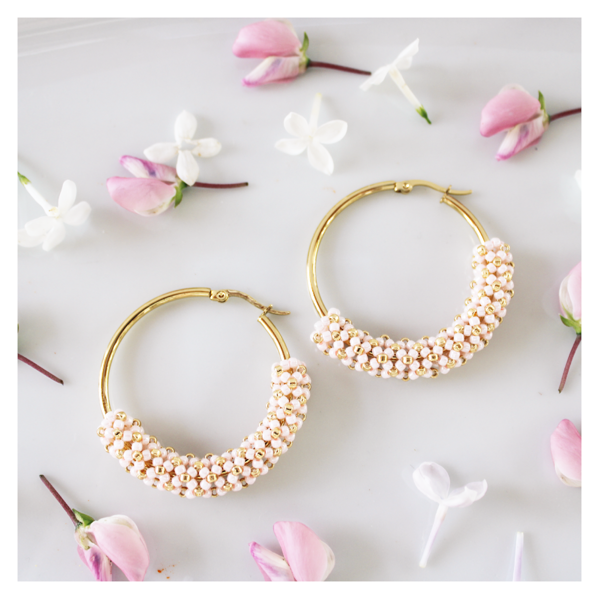 Näyttävät TUBE HOOP-rengaskorvakorut on punottu pienistä lasihelmistä helmi kerrallaan. Saatavana useita ihania värejä.